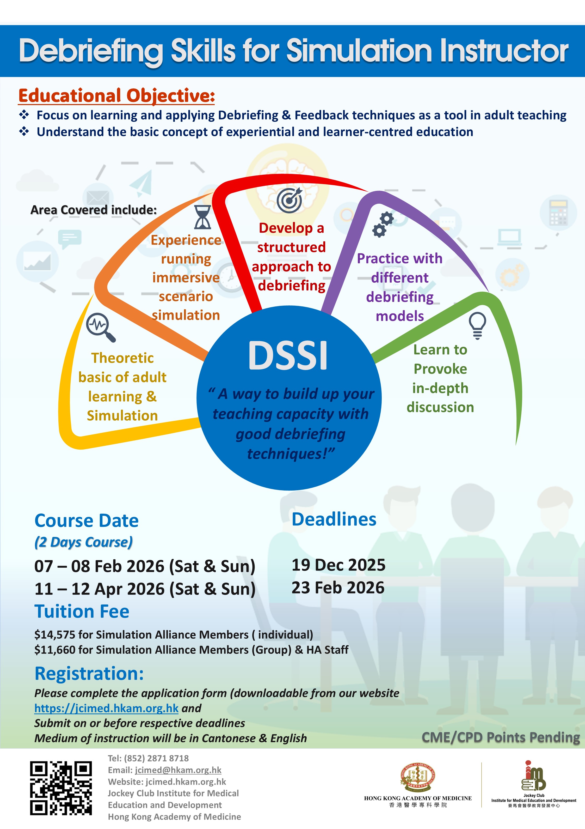 Debriefing Skills for Simulation Instructor (DSSI) course aims to provide the essential knowledge and skills to develop learners’ competence in debriefing methods commonly used in simulation training courses. In this course, the learners will have an understanding of the basic concepts of experiential and learner-centred education, and develop skills in a structured approach to debriefing. On completion of the course, the learner will be able to facilitate a simulated scenario and apply adult learning methods in the teaching activity. The learner will also be exposed to the concept of team-based training and crew resource management elements during the learning activities.